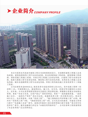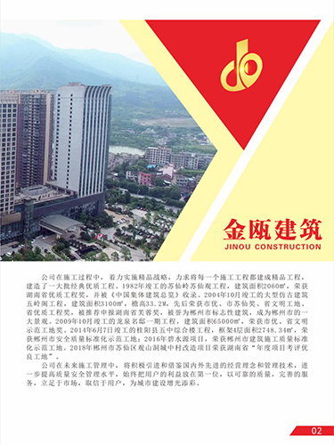 湖南郴州金甌建筑有限公司簡介本公司系原永興縣油市建筑工程公司改制重組而設立。于1998年實現資質升級,取得省住房和城鄉(xiāng)建設廳頒發(fā)的建筑工程施工總承包貳級資質,建筑裝修裝飾工程專業(yè)承包貳級、防水防腐保溫工程貳級、建筑幕墻工程貳級、消防設施工程施工貳級、市政公用工程施工總承包叁級、古建筑工程專業(yè)承包叁級、地基與基礎工程專業(yè)承包叁級、鋼結構工程專業(yè)承包叁級、水利水電工程施工總承包叁級、城市及道路照明工程專業(yè)承包叁級、環(huán)保工程叁級及施工勞務企業(yè)資質等十三項專業(yè)施工資質。