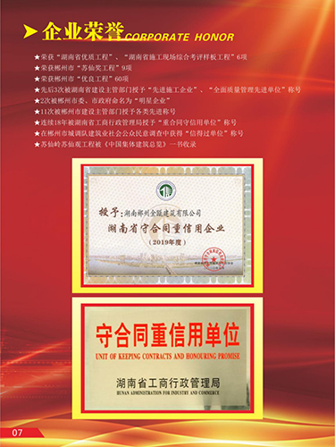 公司注冊資本金6000萬元,現有各類專業(yè)技術管理人員135人,其中具有高級工程師(經濟師) 3人,中級職稱工程師、會計師31人,一級建造師7人,貳級建造師16人,取得建筑工程崗位證的施工員、安全員,質量員等人員89人。近年來,公司認真貫徹落實國家有關建設工程法律法規(guī),積極推行質量安全標準化管理,狠抓工程質量安全管理,秉承“對業(yè)主負責,讓用戶放心”的經營理念,堅持“一流的建筑質量、一流的施工安全、一流的生產效率”的公司宗旨,優(yōu)良率80%以上。先后榮獲省、市級“優(yōu)質工程”、“施工現場綜合考評樣板工程”65項,郴州市“蘇仙獎工程”9項,“湖南省優(yōu)質工程”4項。公司先后16次被省、市建設主管部門授予“先進施工企業(yè)”稱號,2次被郴州市委、市政府命名為“明星企業(yè)”,連續(xù)9年被省工商行政管理部門授予省級“重合同守信用單位”稱號,被市金融部門評定為“AA級信用等級單位”。在郴州市城調隊建筑業(yè)社會公眾民意調查中獲“信得過單位”稱號。公司信譽和工程質量得到了社會各界的廣泛認同和肯定。